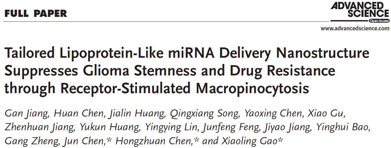 近日,开元集团陈红专教授团队在国际知名期刊Advanced Science(《尖端科学》)发表题为“Tailored Lipoprotein‐Like miRNA Delivery Nanostructure Suppresses Glioma Stemness and Drug Resistance through Receptor‐Stimulated Macropinocytosis”的文章,并入选该期刊封面论文之一。该研究综合运用肿瘤干细胞,仿生纳米和microRNA等手段探索神经胶质瘤的药理学调控和干预新策略。Advanced Science是Wiley旗下高质量开放获取期刊(影响因子15.8),刊载覆盖材料科学、物理、化学、医学、生命科学等交叉学科领域的基础和应用研究。