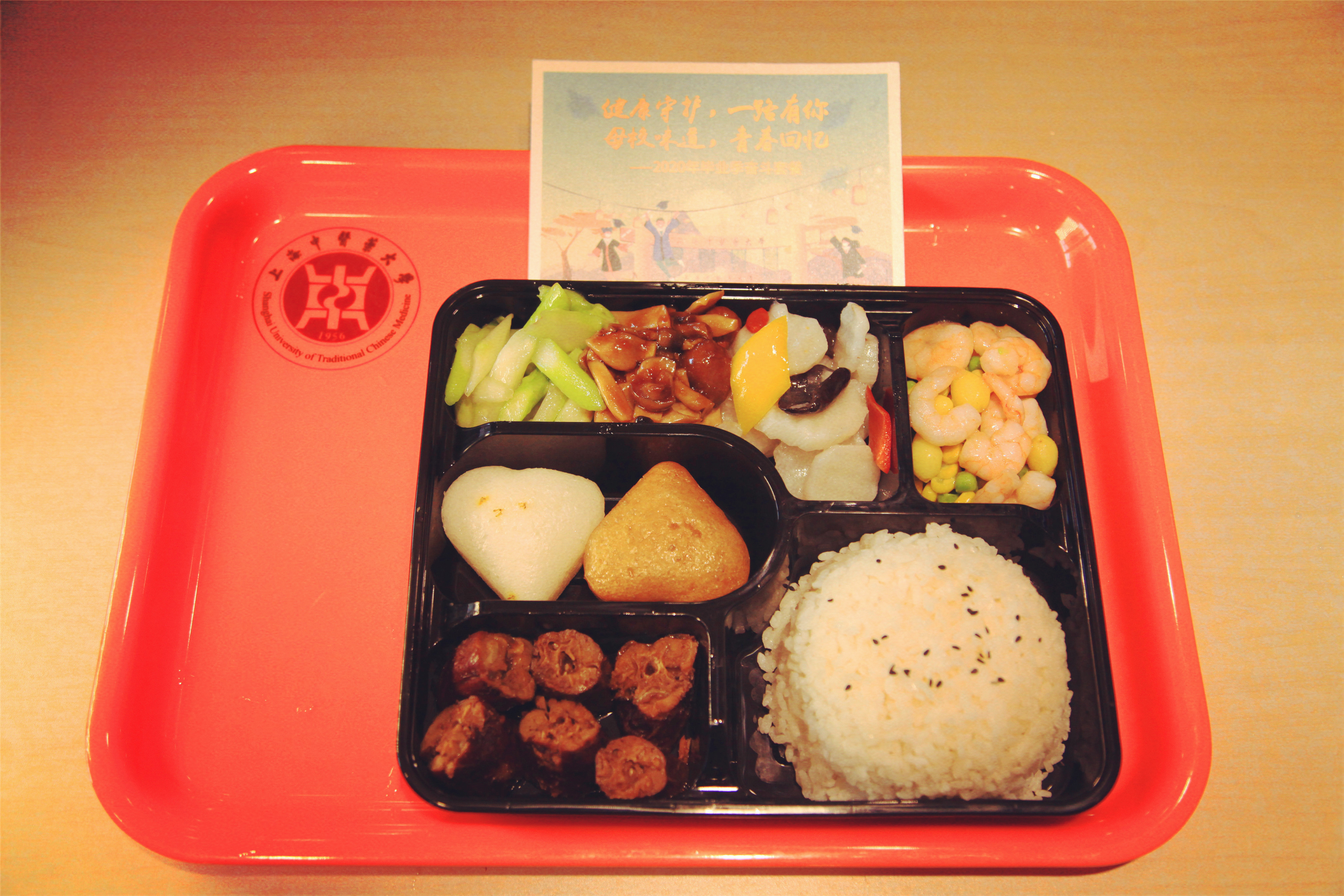 打开餐盒,摆盘精美别致,菜品设计饱含寓意,食疗养生的餐品食材充满惊喜:“青春”芦笋菌菇生津益胃、“人生”虾仁白果补虚敛肺、“出彩”五色山药健脾固肾,清爽而可口,美味又营养,体现了中医药专业院校食堂的健康餐饮理念。再搭配一道“爱心”糯米糖糕作为餐后甜点,更包含着所有后勤服务人员对杏林学子的用心与细心,寄托了母校食堂对广大毕业学子的衷心祝福及深切期望。