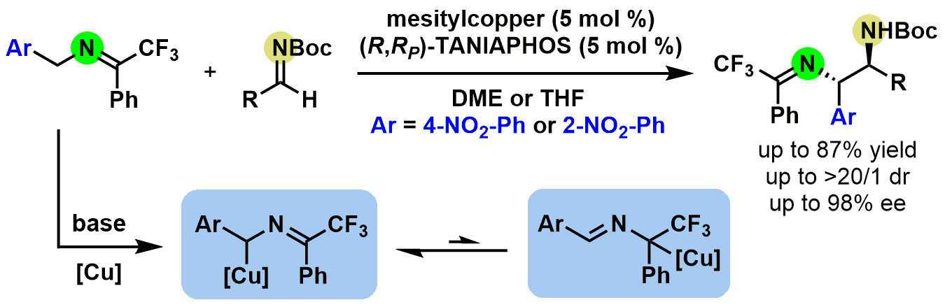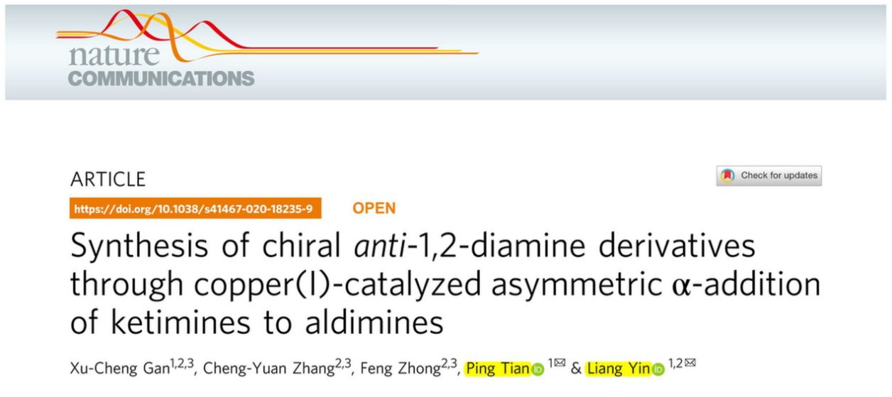 近日,开元集团创新中药研究院林国强院士团队在《自然通讯》(Nature Communications)上发表研究论文Synthesis of chiral anti-1,2-diamine derivatives through copper(I)- catalyzed asymmetric α-addition of ketimines to aldimines,采用铜催化的亚胺的不对称分子间交叉偶联反应,高效且立体专一性地构建了天然产物中常见的手性二胺骨架。