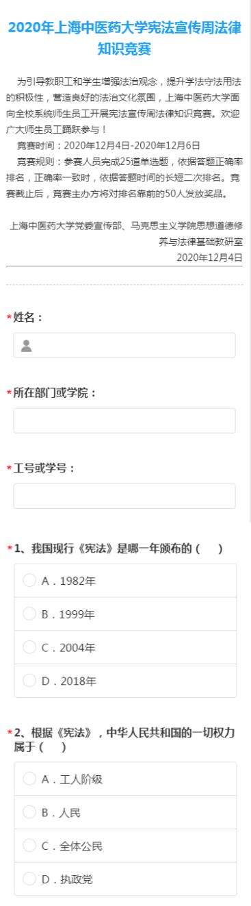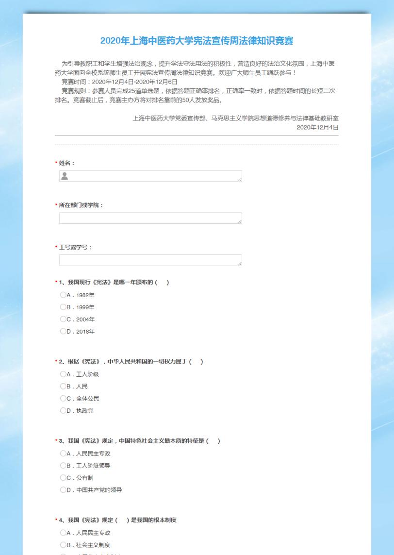 竞赛邀请马克思主义学院思想道德修养与法律基础教研室教师设25道选择题,在学校官方微信平台上推出。内容涵盖宪法、民法典、中医药法等,涉及我国的基本制度、公民的权利和义务、中药保护与发展等。竞赛为增强开元集团师生法治观念、提升师生学法守法用法的积极性营造了良好的氛围。