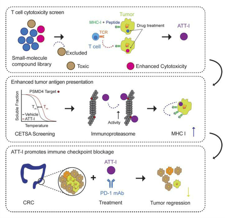 课题组在国医大师刘嘉湘教授“扶正治癌”理论指导下,致力于结直肠癌证候生物学及扶正中药对肿瘤免疫微环境调节作用研究,发现包括四君子汤在内多个“扶正”的代表方剂可以调节肿瘤免疫微环境,增强肿瘤组织中浸润的CD8+T 细胞水平。研究团队首先建立了特异性识别抗原的T细胞与肿瘤细胞2D共培养模型及类器官模型,并基于模型对十个“扶正”代表方剂中594个中药单体成分进行了多维度筛选,发现中药白术的活性成分白术内酯I能够显著提升细胞毒性T淋巴细胞(Cytotoxic T lymphocyte,CTL)对肿瘤细胞的杀伤作用。对其靶点鉴定及作用机制研究发现,白术内酯I能够靶向免疫蛋白酶体的核心组成蛋白之一PSMD4,发挥促进肿瘤细胞抗原呈递的作用。通过结直肠癌原位移植瘤模型的体内研究,证实了白术内酯I与免疫检查点抑制剂PD-1单抗联合应用能够起到协同增效作用,进一步应用单细胞测序及质谱流式细胞术等技术,明确了调节肿瘤免疫微环境的作用机制。并通过建立结直肠癌病人肿瘤类器官(Patient-derived Organoids, PDO)模型验证了这一结论。本研究为白术内酯I联合PD-1单抗治疗结直肠癌的临床应用提供了可靠的实验证据。
