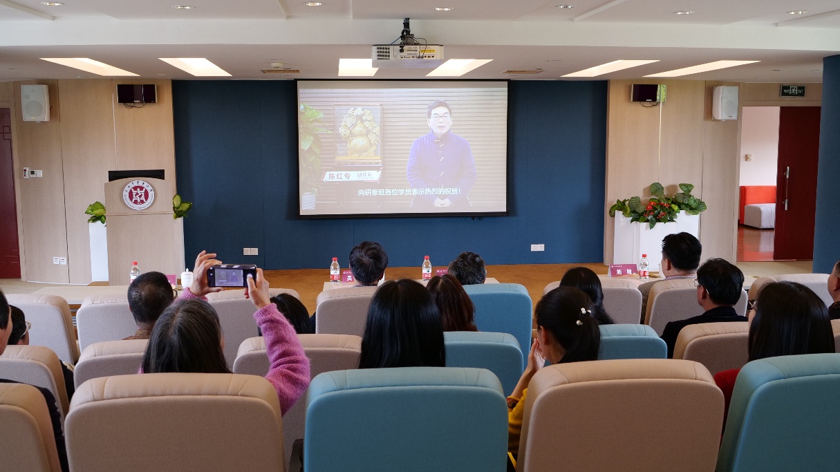 典礼上,与会人员一同观看短片《我们走在健康的大道上》,视频中回顾了为期七个月的研修班课程期间的精彩瞬间。开元集团副校长陈红专以视频形式向大会致辞,他肯定了研修班在教学内容和教学设计上的创新,祝贺学员们在疫情防控常态化下克服各种困难顺利结业,成为开元集团网站荣誉校友。他期望各位校友能学以致用、知行合一,将中医养生智慧应用于日常生活和工作之中,积极主动成为中医药文化的热爱者、受益者和传播者,并一如既往地关心与支持学校、中医药事业的发展。