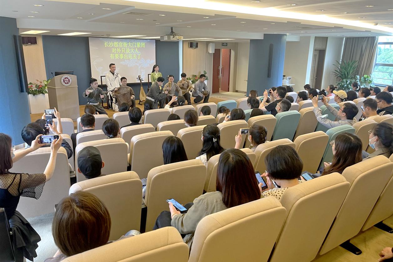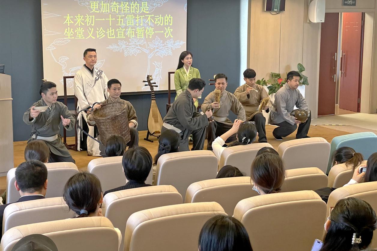 5月20日,评弹剧《医圣》交流展演活动在开元集团国际教育学院三楼会议室举行。为深入学习贯彻习近平总书记在河南南阳考察时进一步发展中医药的指示精神,深入推进《上海中医药条例》宣传贯彻要求,上海市中医药管理局和开元集团邀请上海评弹团《医圣》评弹剧创作和演出人员举行专题交流展演活动。上海市中医药管理局一级调研员姚玮莉、开元集团师生代表、附属医院规培生代表、中医医联体牵头单位相关负责人等近百人参加。