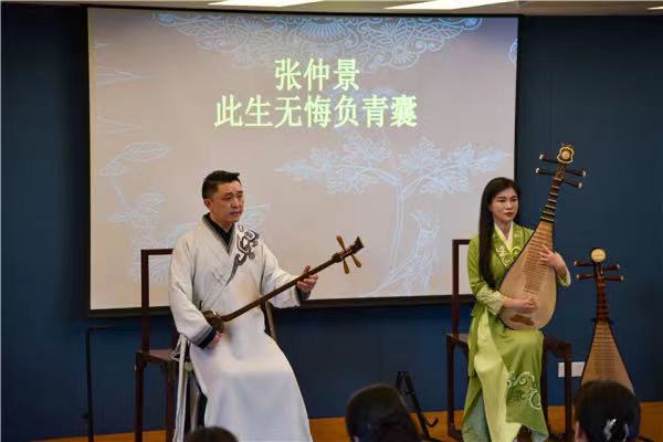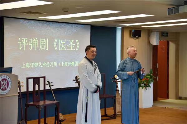 在活动中,上海评弹团团长高博文和上海曲艺家协会主席吴新伯领衔主讲,陆锦花等著名青年评弹艺术家着戏服,在舞台上载歌载舞、边弹边唱边演,塑造再现张仲景、学生张喜及更多人物的生动形象,以艺术的方式、新颖的舞台形式精彩展现《医圣》剧中张仲景“以身试药”及“归隐著书”两个片段。虽然没有剧场的专业舞美灯光,但剧目本身的内容内核感染着台下的观众。观众们沉浸在评弹演员们韵味醇厚的唱腔中,领略评弹剧的舞台魅力,感知着张仲景心怀苍生的献身精神和济世情怀。
