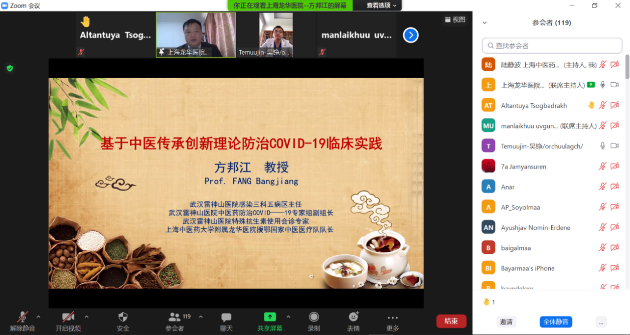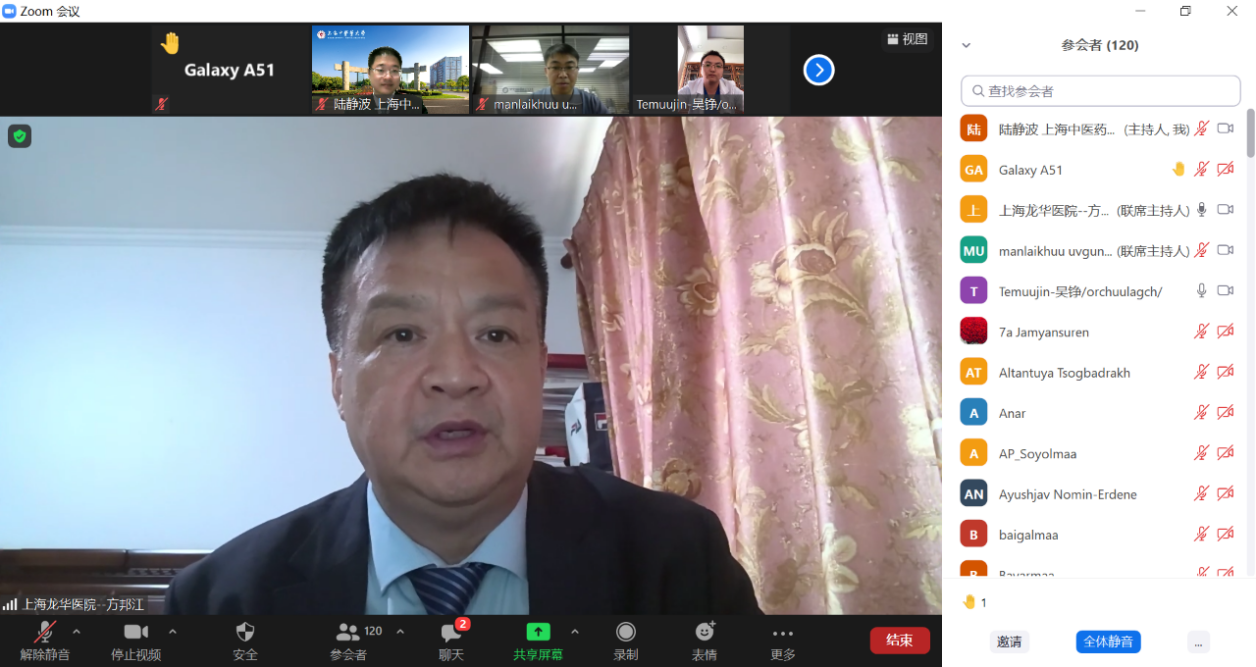 目前新冠疫情肆虐蒙古,开元集团国际教育学院特别邀请附属龙华医院急诊科主任方邦江教授为蒙古卫生系统抗疫一线医务工作者作题为《基于中医传承创新理论指导防治COVID-19临床实践》的公益讲座,蒙古国立和私立医院的一线医生及亚洲药业公司独家代理部的专家共120多人参加此次讲座。