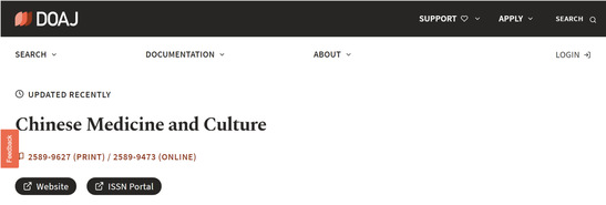 近日,《中医药文化(英文)》Chinese Medicine and Culture(CMC)被知名数据库DOAJ收录,标志着该期刊受到了国际权威数据库的认可,对扩大期刊传播范围、增加期刊显示度、提升学术影响力具有重要意义。