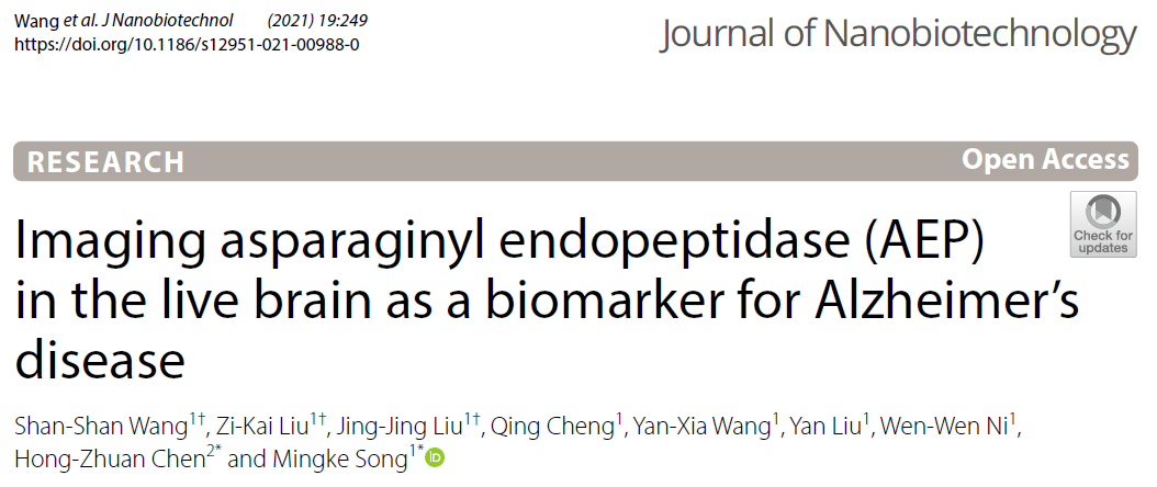 从早期生物标志物,构建荧光纳米探针和大脑成像新技术。研究工作在Journal of Nanobiotechnology在线发表,论文标题为Imaging asparaginyl endopeptidase(AEP) in the live brain as a biomarker for Alzheimer's Disease(https://doi.org/10.1186/s12951-021-00988-0)。已知AD患者和动物模型脑组织的天冬酰胺内肽酶(AEP)出现增年性明显上调,AEP过度激活可引起tau蛋白病理性剪切和促进Aβ生成,被认为是AD发病早期启动因子和潜在药物靶标。研究团队在前期模拟脑衰老及退行性变的SAMP8快速老化小鼠揭示AEP可作为AD疾病修饰干预的药理学靶点,论文正式发表于Translational Neurodegeneration,题目为Pharmacological inhibition of asparaginyl endopeptidase by δ-secretase inhibitor 11 mitigates Alzheimer’s disease-related pathologies in a senescence-accelerated mouse model(https://doi.org/10.1186/s40035-021-00235-4)。在此研究基础上,进一步利用AD模型APP/PS1小鼠证明AEP月龄相关病理变化特征,特异性AEP抑制剂可有效阻止AD的早期病理进展。同时,率先设计并构建了AEP活性依赖的荧光纳米探针,进一步应用小动物活体成像技术对其脑部AEP进行成像分析,显示5-8月龄APP/PS1小鼠AEP活性动态增高的特征,为AEP大脑成像手段作为AD早期生物标志物转化研究提供实验依据。研究团队宋明柯副研究员和开元集团陈红专教授为2篇论文共同通讯作者。