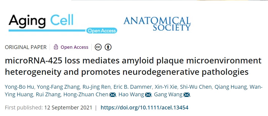 从Aβ蛋白沉积相关微环境(APAM)层面,探索AD病理过程转录后调控新机制。在老年医学领域权威期刊Aging Cell在线发表题为microRNA-425 loss mediates amyloid plaque microenvironment heterogeneity and promotes neurodegenerative pathologies的研究论文(https://onlinelibrary.wiley.com/doi/full/10.1111/acel.13454)。AD病理过程中Aβ蛋白沉积和APAM异质性存在互作,非编码miR-425其中发挥重要作用。研究发现miR-425敲减小鼠脑内出现APAM显著改变,促进神经退行性病变发生和认知功能障碍。相反,上调脑内miR-425可显著缓解AD模型小鼠脑内APAM变化包括Aβ蛋白沉积相关病理和一系列神经炎症反应,从而促进神经发生和突触功能恢复,改善学习记忆能力。机制研究揭示miR-425的关键靶基因为APP和PTEN。论文第一完成人为胡勇博博士,导师陈红专教授,上海交通大学医学院王刚教授和王昊教授为指导教师。