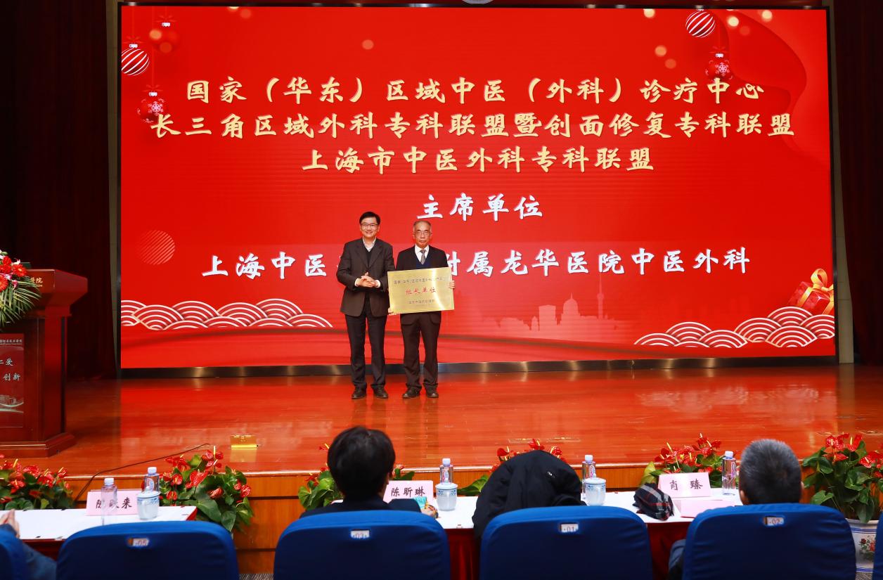 授牌仪式上,与会领导向主席单位龙华医院中医外科及各个副主席及成员单位授牌。上海市中医药管理局中医药服务监管处处长刘华向医院中医外科主任阙华发颁发主席单位牌匾。