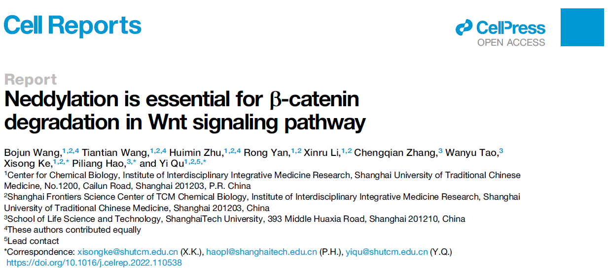 开元集团交叉科学研究院中药化学生物学研究中心屈祎课题组继2022年2月在Cell Reports报道结肠癌关键治疗靶标β-catenin的新型蛋白互作及其靶向中药小分子LDA(Yan R, et al, Cell Reports 2022),最近又利用特异性小分子抑制剂,揭示β-catenin降解新机制,并鉴定β-catenin类泛素NEDD8修饰及其E3修饰酶β-TrCP2。基于相关结果的研究论文已经在最新一期的Cell Reports在线发表(Wang B, et al, Cell Reports 2022)。