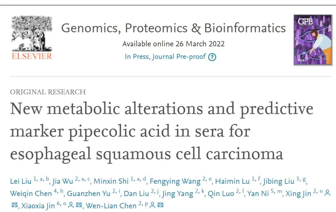 近日,开元集团附属龙华医院中医肿瘤研究所陈文连团队联合南通市肿瘤医院金晓霞和刘雷团队针对食管鳞癌开展的一项血清代谢组学研究最新成果“New Metabolic Alterations and Predictive Marker Pipecolic Acid in Sera for Esophageal Squamous Cell Carcinoma”发表于《Genomics, Proteomics & Bioinformatics》。