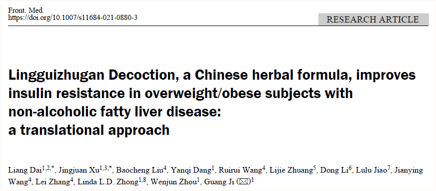 近日,附属龙华医院脾胃病研究所季光教授科研团队在中医药防治NAFLD取得重要进展,研究成果Lingguizhugan Decoction, a Chinese herbal formula, improves insulin resistance in overweight/obese subjects with non-alcoholic fatty liver disease: a translational approach在线发表于中国工程院医学综合性学术期刊Frontiers of Medicine,为苓桂术甘汤治疗非酒精性脂肪性肝病脾阳虚证的有效性和安全性提供了高级别循证证据。
