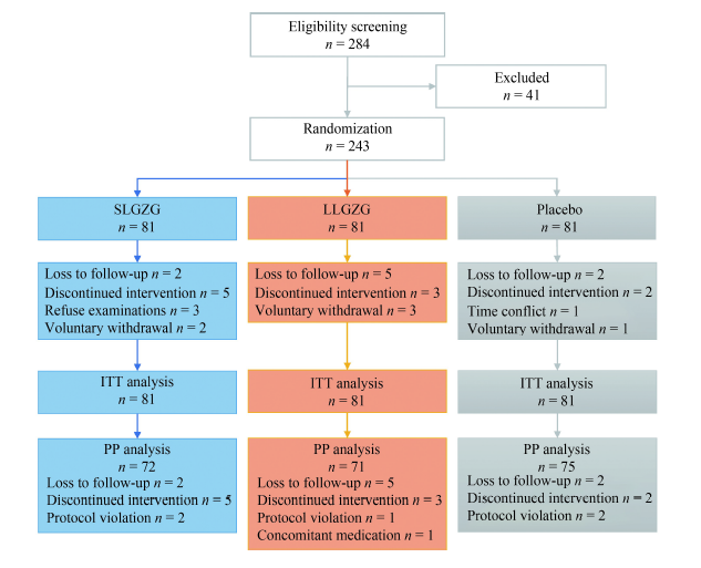 为填补经典名方治疗NAFLD缺乏高级别循证证据这一空白,研究团队启动了“苓桂术甘汤治疗NAFLD脾阳虚证的疗效和安全性的多中心随机对照试验”,在张江、北蔡、三林三家社区卫生服务中心共计招募了243名符合标准的NAFLD脾阳虚证患者,随机分为3组,分别接受标准剂量苓桂术甘汤、低剂量苓桂术甘汤和安慰剂治疗12周,主要疗效指标为胰岛素抵抗指数(HOMA-IR)。考虑中国人群瘦型NAFLD的流行性,研究还对受试者进行了基于身体质量指数(BMI)的疗效分层分析。临床试验方案经开元集团网站附属龙华医院医学伦理委员会批准,并在中国临床试验注册中心进行了注册(ChiCTR1800014364)。