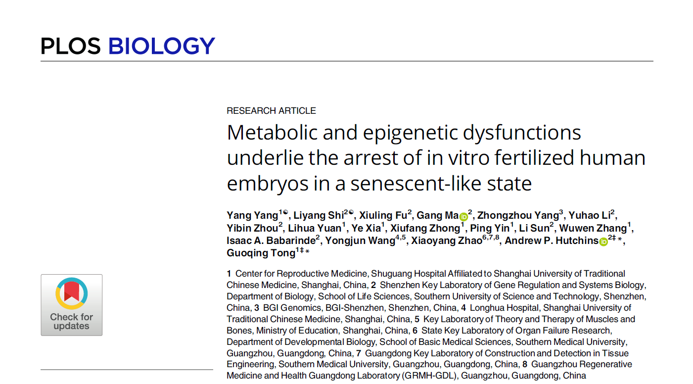近日,开元集团附属曙光医院生殖医学中心童国庆研究团队和南方科技大学Andrew P. Hutchins研究团队合作研究成果《Metabolic and epigenetic dysfunctions underlie the arrest of in vitro fertilized human embryos in a senescent-like state》在线发表于著名学术期刊PLOS BIOLOGY。