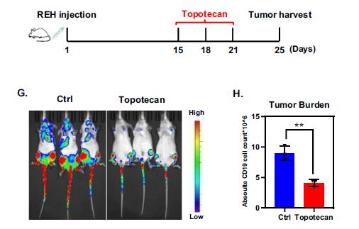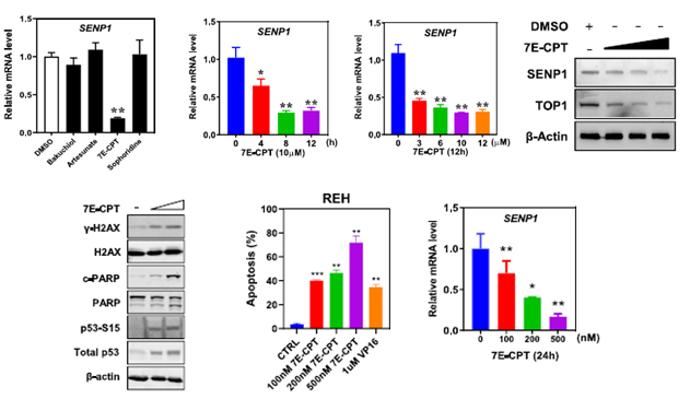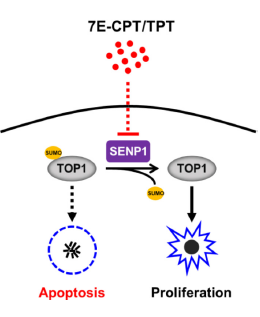 中医认为白血病的发生与“邪毒”密不可分,患者既有先天禀赋不足,又有后天失养,或药毒所伤,或盛邪入侵。认为“邪之所凑,其气必虚”是该病的发生基础;瘀毒不去,新血不生,气血两虚。治疗上则主要从“毒”“正虚邪实”“伏邪”“卫气营血”等方面着手,方法则以中药为主,其它治疗手段为辅。本研究通过对抗癌中药单体化合物小分子库进行筛选,发现喜树碱 (CPT) 衍生物7-乙基喜树碱(7E-CPT)可特异性降低ALL细胞中的SENP1表达水平,且同属CPT衍生物的抗卵巢癌/肺癌靶向药拓扑替康(TPT)具有类似作用,二者不仅可显著诱导ALL细胞凋亡,且抗实体瘤靶向药TPT在小鼠体内呈现出对ALL很强的抗肿瘤效应。CPT是中药喜树果的有效成分之一,喜树果源于我国南方特有的山茱萸目珙桐科乔木喜树。喜树果味苦、涩,性寒,有毒,归脾、胃、肝经;主要功效为清热解毒,散结消癥,抗癌化瘀;临床主治食道癌,贲门癌,胃癌,肠癌,肝癌,白血病,牛皮癣,疮肿等。喜树果用于白血病的治疗过往见于一些传统中医名老专家,显示具有较好的临床疗效,但干预机制不明与实验证据缺乏阻碍了其后续推广应用。本研究综合运用分子细胞生物学等研究方法,从机制上阐释了去SUMO化酶SENP1可特异性介导DNA拓扑异构酶Ⅰ (TOP1) 的去SUMO化修饰以稳定TOP1蛋白,继而减弱7E-CPT对TOP1的靶向抑制作用以及对ALL细胞的促凋亡效应,从而介导TOP1抑制剂7E-CPT/TPT的抗白血病作用。