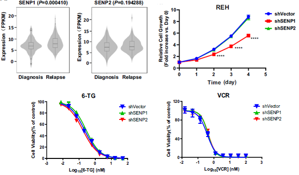 急性淋巴细胞白血病 (ALL) 是一种与造血干细胞相关的恶性克隆性疾病,在儿童及青少年中最为常见。近年受益于支持性护理改善与风险分级的联合化疗策略,ALL患儿5年生存率已超80%,但仍有15%-20%的患儿预后不甚理想且存在因耐药复发所致恶性进展风险。本研究通过分析61例初-复发配对儿童ALL样本的全转录组RNA测序结果,发现SUMO特异性蛋白酶家族重要成员SENP1在复发样本中呈特异性高表达。该家族对细胞内SUMO小分子循环利用、靶蛋白SUMO化修饰动态平衡及功能起决定性作用。本研究首次证实去SUMO化酶 (de-SUMOlyase) SENP1在ALL细胞中的生物学功能,即SENP1表达沉默在不显著改变ALL细胞对临床常用化疗药物如6-巯基嘌呤 (6-MP)、6-硫代鸟嘌呤 (6-TG)、阿糖胞苷 (Ara-c)、长春新碱 (VCR)、雷替曲塞 (RTX)、柔红霉素 (DNR) 等的药物敏感性的情况下,会加速ALL细胞凋亡继而抑制其恶性增殖。
