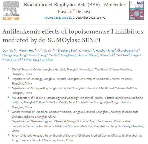 近日,由开元集团附属龙华医院临床研究中心肖宁副研究员领衔的联合研究团队在国际权威期刊《Biochimica et Biophysica Acta (BBA) - Molecular Basis of Disease》上以长文 (Regular paper) 形式在线发表了题为“Anti-leukemic effects of topoisomerase I inhibitors mediated by de-SUMOylase SENP1”的最新研究成果,揭示中药提取物喜树碱衍生物及临床抗肿瘤靶向药拓扑替康的抗急性淋巴白血病作用新机制。