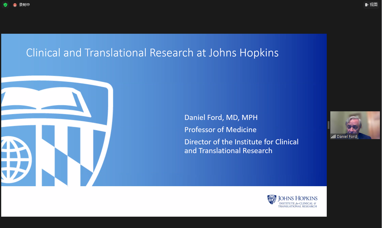 开班仪式结束后,霍普金斯大学临床和转化研究所所长丹尼尔-福特教授以“约翰-霍普金斯大学临床和转化研究”为题为与会学员进行开班第一课。