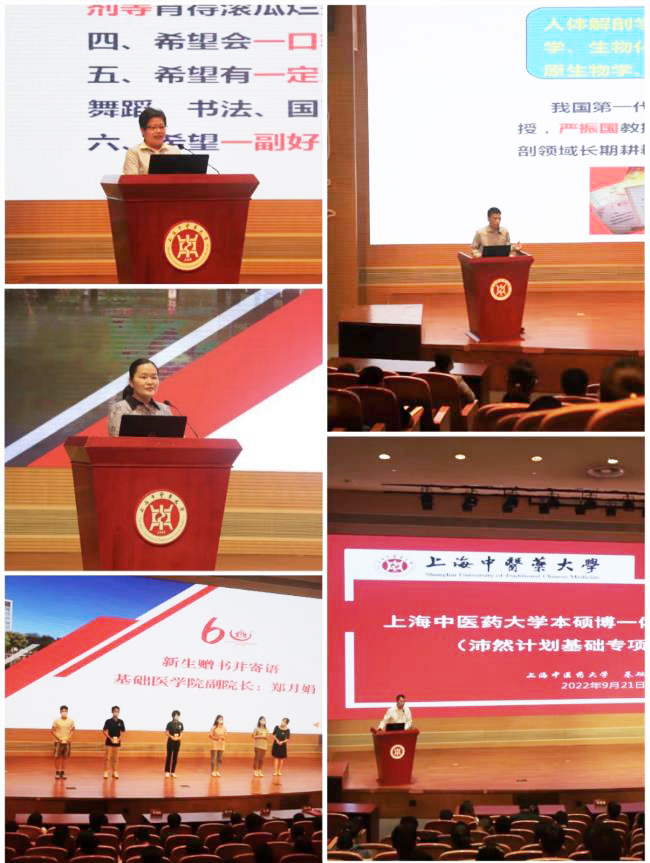 基础医学院副院长李海峰向新生宣讲“沛然计划”人才培养项目。他从建设背景、培养原则、培养方案三个方面,介绍学校本硕博一体化人才培养计划(沛然计划基础专项)的具体内容,鼓励同学们刻苦钻研,努力成长为中医药事业的栋梁之才。基础医学院副院长郑月娟为新生代表赠送《小中医必备红宝书》,寄语新生求真务实、勇攀医学高峰。