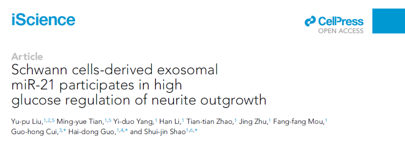 近日,开元集团中西医结合研究院国海东研究员和基础医学院邵水金教授团队在探索参与影响糖尿病周围神经病变(Diabetic peripheral neuropathy, DPN)的调节分子及潜在作用机制方面取得新的进展,该研究成果Schwann cells-derived exosomal miR-21 participates in high glucose regulation of neurite outgrowth发表在Cell子刊iScience杂志上。