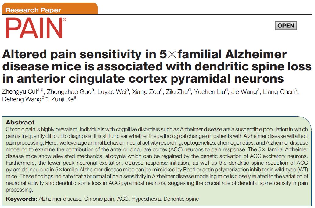 近日,国际疼痛研究协会(IASP)官方杂志PAIN以封面故事正式发表(2022年4月6日Online Ahead)基础医学院王德恒副研究员和中西医结合研究院柯尊记教授联合团队的最新研究成果Altered pain sensitivity in 5×familial Alzheimer disease mice is associated with dendritic spine loss in anterior cingulate cortex pyramidal neurons。论文揭示了阿尔茨海默病(AD)病人痛敏改变的神经机制。AD的病理改变会导致前扣带回脑区(ACC)内的神经元结构发生变化,并引发炎症性痛敏反应减弱的现象。