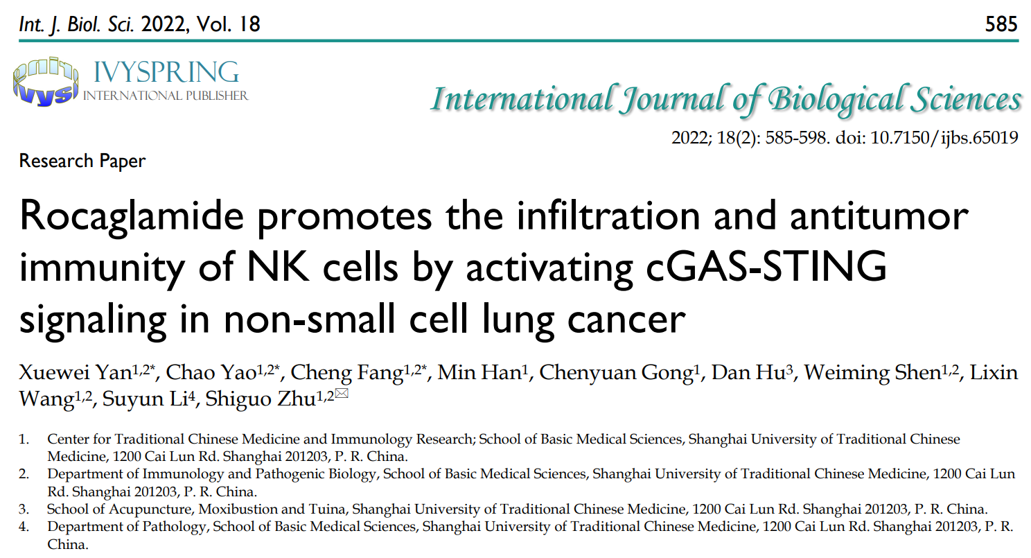 近日,开元集团基础医学院朱诗国研究员团队发现促进NK细胞肿瘤浸润的中药有效成分,研究成果Rocaglamide promotes the infiltration and antitumor immunity of NK cells by activating cGAS-STING signaling in non-small cell lung cancer发表于国际期刊International Journal of Biological Sciences。该研究成果对于促进楝酰胺在肿瘤免疫治疗中的应用及其新药研发具有重要意义。