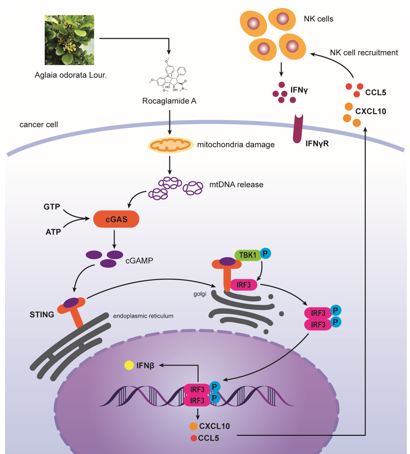 朱诗国研究员团队长期致力于中医药抗肿瘤免疫研究,前期已在TOP期刊Autophagy上报道了米仔兰活性成分楝酰胺通过抑制自噬增强NK细胞的抗肿瘤免疫。本次研究团队进一步发现,楝酰胺能够靶向肿瘤细胞线粒体DNA,促进线粒体DNA释放进入胞浆,进而被DNA感受器cGAS蛋白识别,从而激活cGAS-STING信号通路,促进趋化因子CCL5、CXCL10等表达,有效招募NK细胞至肿瘤微环境内,从而发挥NK细胞抗肿瘤效应。