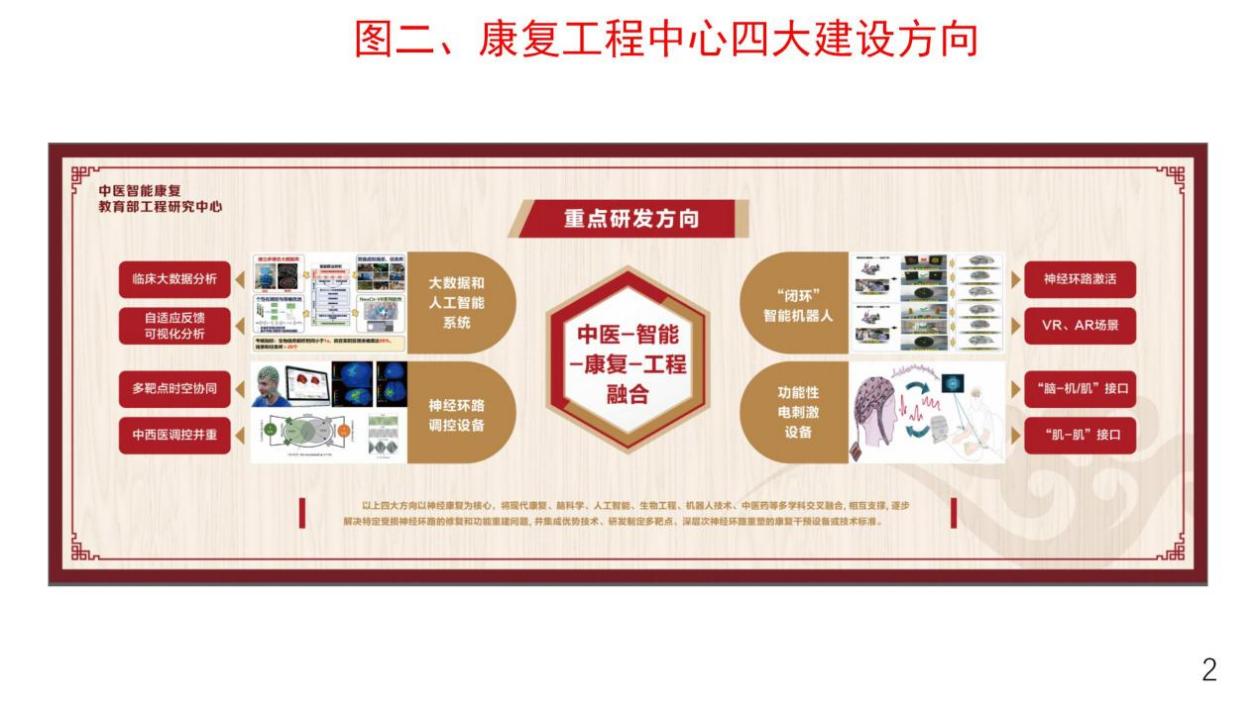 中医智能康复教育部工程研究中心自启动建设以来,在大学康复学科建设与发展领导小组、工程中心管理委员会和技术委员会、康复医学院等统一指导和协同管理下,从制度建设、平台建设、人才培养、团队建设、资金支持、项目研发、技术转化、临床基地、社会推广等方面,均取得了阶段性成果。在四个主体研究方向上实现了同步推进、相互支撑和学术融合,并重点加强中医技术和理论与现代康复、工程技术及大数据的融合创新。将于2023年通过教育部验收,并将建成为中国一流、世界有影响的中医药特色的国家工程研究中心。