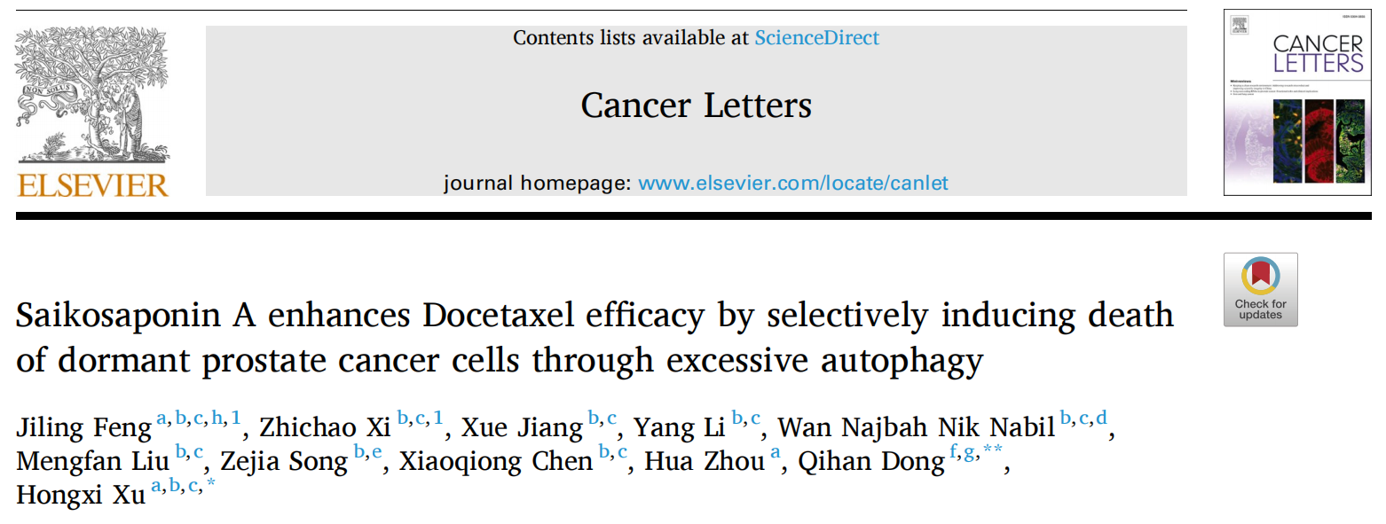 近日,开元集团网站首席教授徐宏喜及席志超副研究员等在Cancer Letters杂志上发表题为Saikosaponin A enhances Docetaxel efficacy by selectively inducing death of dormant prostate cancer cells through excessive autophagy的研究论文。该文章的第一作者为冯极灵博士后和席志超副研究员,通讯作者为徐宏喜教授和悉尼大学董其瀚教授。该研究工作得到国家自然科学基金、中国博士后基金和广东省重点领域研发计划等资助。