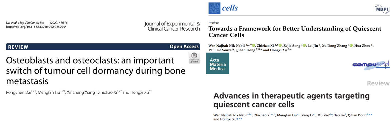 近十年来,徐宏喜教授与席志超副研究员带领的研究团队专注于静止期癌细胞的生物学特征研究及活性先导化合物发现。研究团队建立并完善了一系列静止期癌细胞分子机理研究与药物研发的体内外模型及检测方法,提出了靶向静止期癌细胞的药物研发策略,揭示了骨重塑与肿瘤休眠在癌症骨转移过程中的重要作用,发表在JECCR、Cells和AMM等杂志,相关研究内容先后获得4项国家自然科学基金,以及中国博士后基金和上海市扬帆专项等资助。