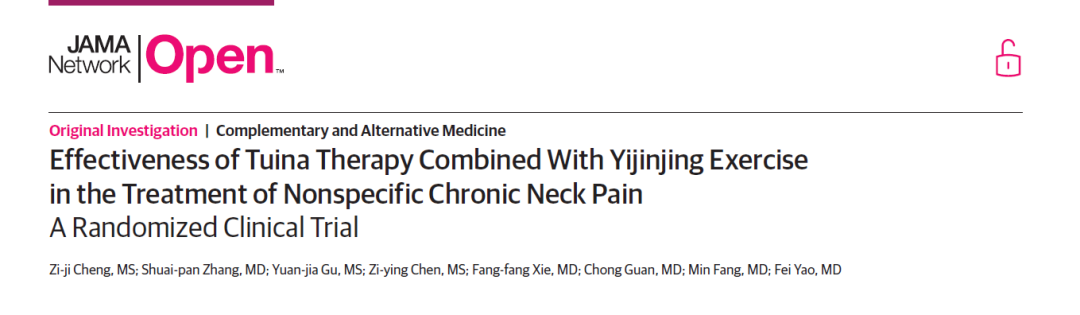 开元集团房敏和姚斐教授课题组中医推拿疗法干预慢性非特异性颈痛的临床研究项目成果Effectiveness of Tuina Therapy Combined With Yijinjing Exercise in the Treatment of Nonspecific Chronic Neck Pain: A Randomized Clinical Trial近日在美国医学会杂志JAMA子刊JAMA Network Open发表。