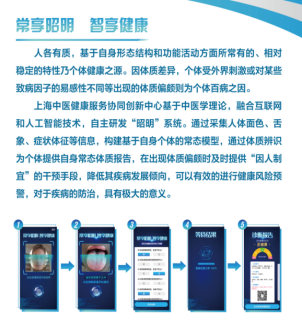 目前研究室已进行了“互联网+中医健康服务”的理论研究,在人工智能领域研发了“常享康”中医药健康管理软件,该软件搭载了具有智能数据采集和图像分析的“昭明”系统,通过建立自身常态模型,提供“因人制宜”的中医药干预方案,实现互联网+中医健康服务。目前该软件已应用于浦东新区小学生体质检测中。