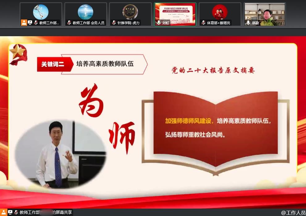 为深入学习宣传贯彻党的二十大精神,引导广大教师进一步坚定理想信念,勇担新时代教育承载的新使命,2022年11月21日至2023年2月28日,校宣传部(党委教师工作部)组织教师党支部书记和青年教师班主任队伍开展了“踔厉奋发 勇毅前行 为党育人 为国育才——深入学习宣传贯彻党的二十大精神”专题培训,参训教师97人。
