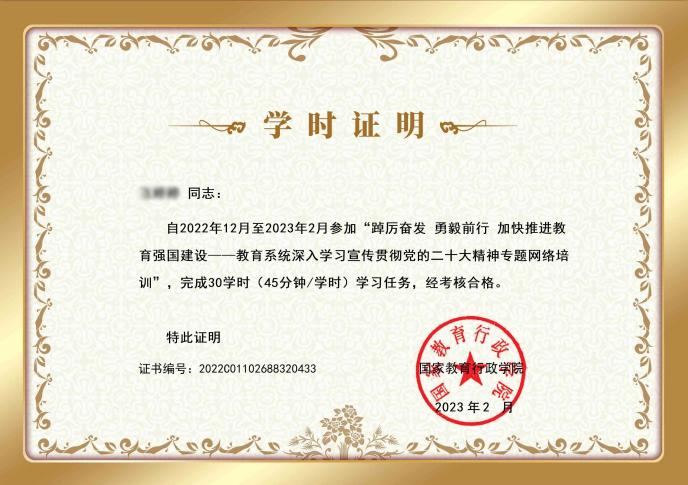 线上培训依托国家教育行政学院网络学习平台开展,分为课程学习、心得撰写、考核测评三个环节。课程学习自2022年12月1日起,共计30学时,“必修课”与“选学课”相结合,“必修课”紧密围绕“党的二十大报告及《中国共产党章程(修正案)》解读”精心设置课程,“选学课”内容分为3个模块,主要包括“坚持科教兴国战略 推动教育高质量发展”“加快实施创新驱动发展战略 为建设科技强国奠基”“贯彻人才强国战略 强化现代化建设人才支撑”三方面。参训教师在完成规定学时的课程学习后,在线参加理论考核测评,并结合培训目标、内容和自身工作实际,撰写学习心得,提交研修成果。经考核,全体学员均已完成既定培训任务,达到预期培训效果。