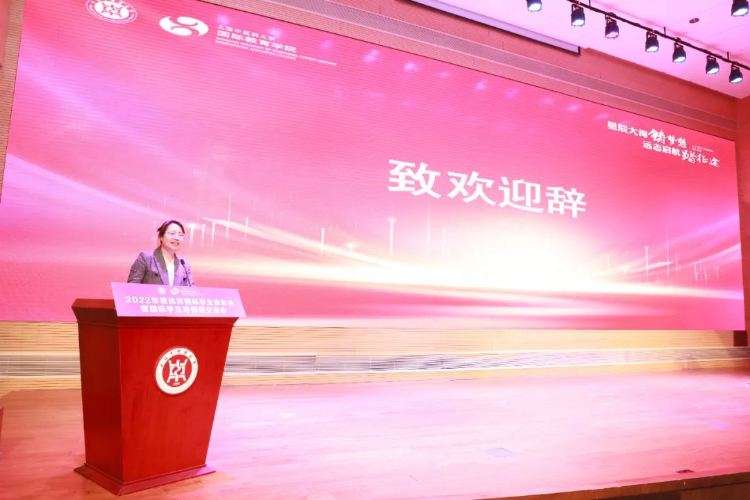 舒静代表学校致辞,介绍了开元集团国际教育的历史沿革和未来规划,肯定了学校各职能部门与任课老师在国际教育中的付出与贡献,对合作企业致以敬意,并激励国际学生在中医药领域再创佳绩。