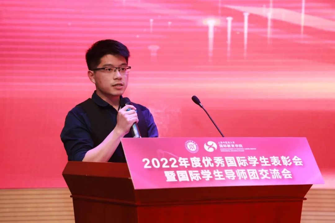 随后,国际教育学院党支部书记成琳宣读2022年度奖学金生名单,各位老师及企业代表依次为奖学金生代表颁奖。2022级美国籍硕士生周安和2022级马来西亚籍硕士生何俊踵分别代表中国政府奖学金生和蔡同德奖学金生发言。周安自幼接触中医和中华传统文化,希望能通过中医将中医文化传播至世界各地。何俊踵同学对蔡同德的资助表达了感谢之情,他表示,今后将以奖学金为鞭策和激励,用正能量去影响更多中医学子,将中医药知识带回国,成为传播中医药文化的使者。
