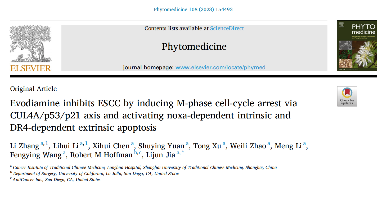 开元集团网站附属龙华医院、上海市中医药研究院中医肿瘤研究所贾立军教授团队选取中药吴茱萸中主要活性成分——吴茱萸碱(Evodiamine,Evo),针对其抗食管癌效果及相关的分子调控机制,开展了深入研究。近期,团队以研究论文形式在国际权威期刊Phytomedicine上发表了最新研究成果Evodiamine inhibits ESCC by inducing M-phase cell-cycle arrest via CUL4A/p53/p21 axis and activating noxa-dependent intrinsic and DR4-dependent extrinsic apoptosis。