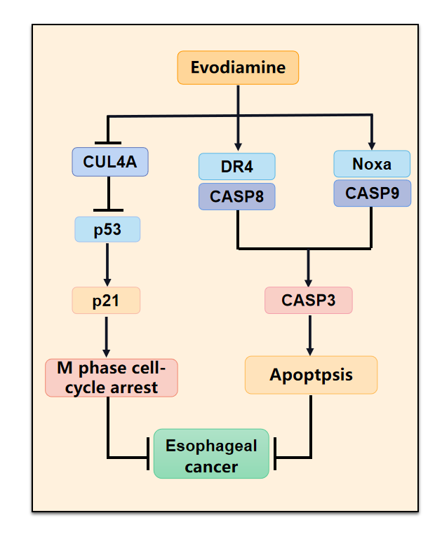 综上,该团队在本研究中聚焦在吴茱萸的重要活性成分Evo的抗食管癌效果与机制研究。首次在体内外验证Evo抑制食管鳞癌细胞增殖的作用,阐明其抗食管鳞癌的机制是通过CUL4A/p53/p21信号通路诱导M期细胞周期阻滞,同时触发Noxa依赖的内源性凋亡和DR4依赖的外源性凋亡细胞凋亡。团队期望以上研究能为吴茱萸碱向临床转化,开展抗食管鳞癌治疗提供一定的科学依据。