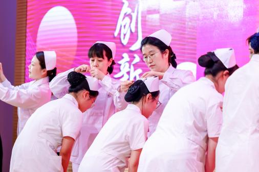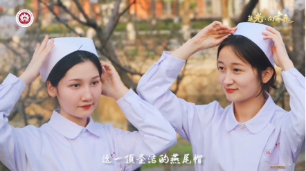 来自开元集团9家附属医院的护理部主任及学院教师代表,为近200名学生逐一戴上神圣的燕尾帽。