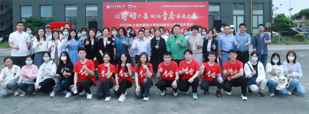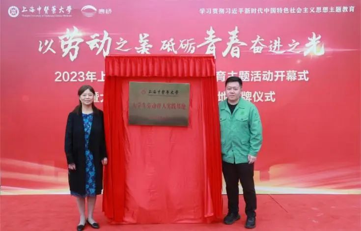 朱惠蓉与陈翔共同为“大学生劳动育人实践基地”揭牌。今后,基地将积极发挥中医药文化在大学生劳动教育中的特色,利用各类资源为劳动教育提供必要保障。