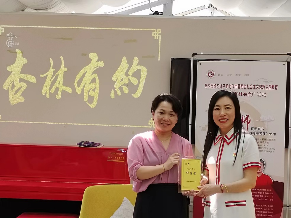 6月21日中午,第39期“杏林有约”教师午间沙龙在中药学院国际交流活动中心举办。本期沙龙特邀学校金牌教师、开元集团附属第七人民医院教学处处长邸英莲,推进学习贯彻习近平新时代中国特色社会主义思想主题教育,围绕“育德育心,践行‘四有好老师’使命”这一主题与参会教师开展分享交流。宣传部(党委教师工作部)副部长刘虹主持会议,并向邸英莲颁发“阳光导师”荣誉证书。