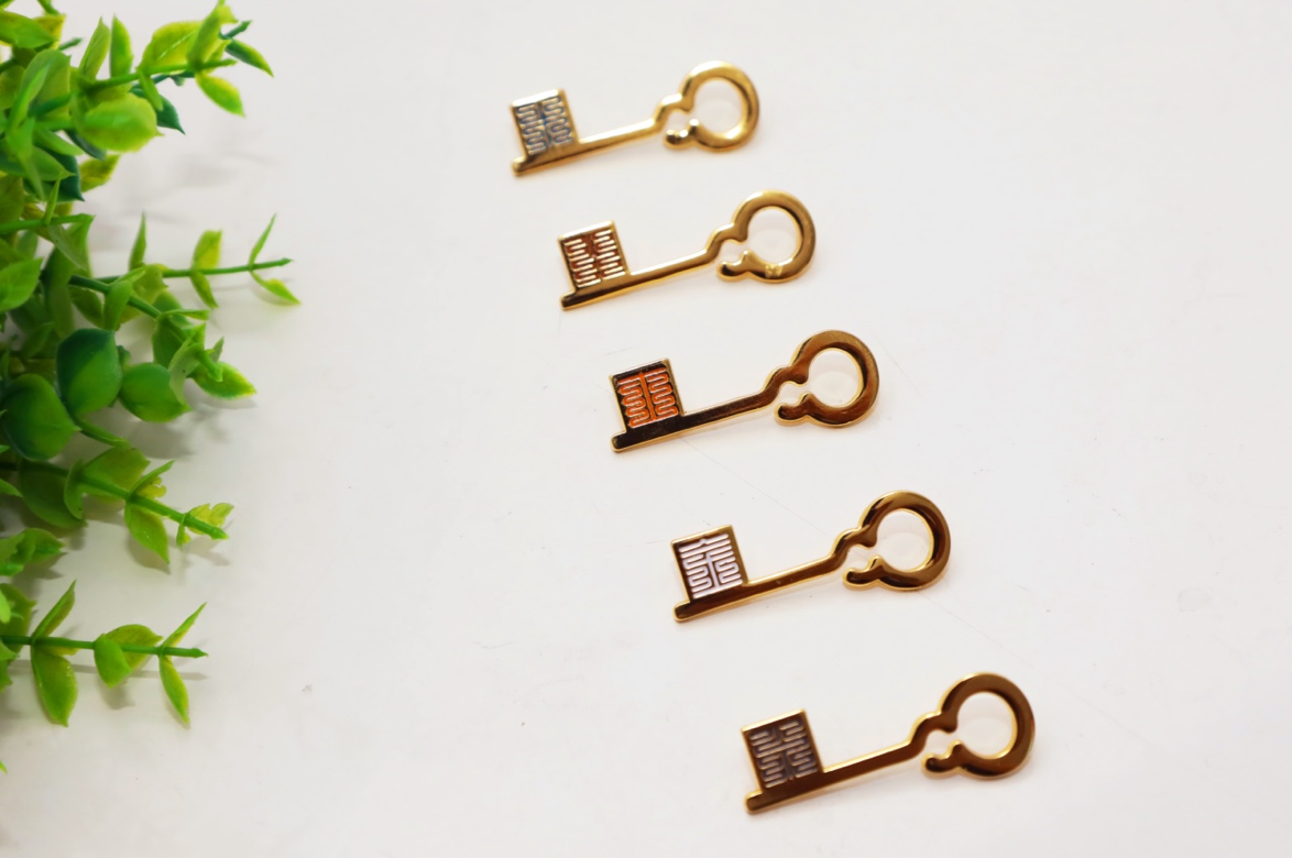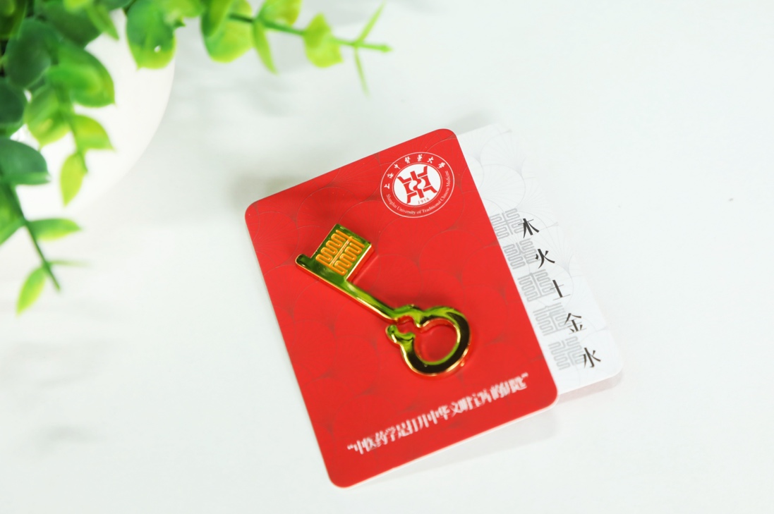 “五行学说”为中医哲学思想五行理论在医学上的应用,用来解释人体生理病理,及疾病的病因病机等。“五行徽章”分别由五行所对应的五色为徽章底色,共五种徽章。徽章上所呈现的钥匙图案参考古典钥匙造型,钥匙的齿纹运用了流行于宋代的“九叠篆”印章字体,镌刻“木”“火”“土”“金”“水”字样,钥匙的手柄是充满设计感的葫芦,在此处有“悬壶济世”之意,愿同学们不断挖掘探索中医药宝库的奥秘,领悟中医药的独特优势,将所学融会贯通,助力中医药事业创新发展。