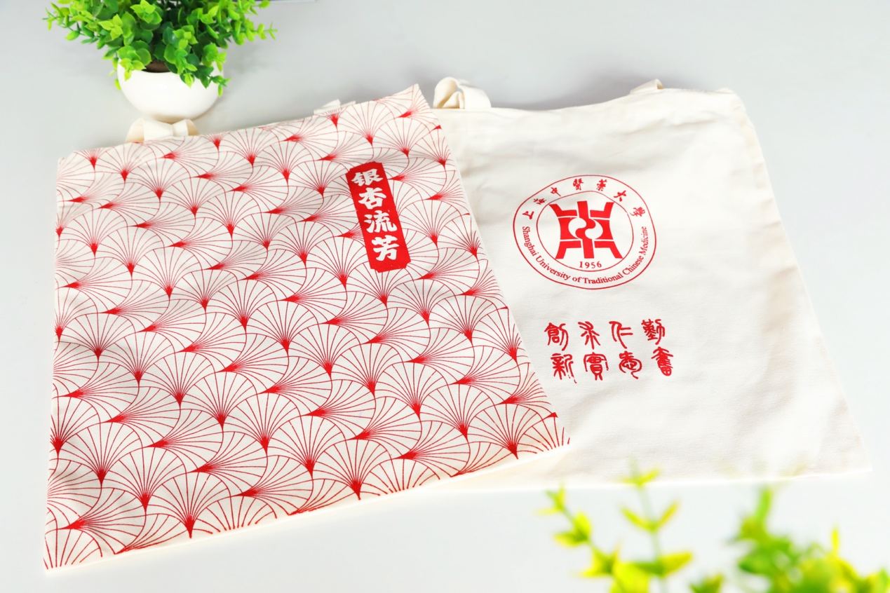 帆布袋正面同样以银杏连续纹为底纹,背面中部为校徽,校徽下方为开元集团网站校训“勤奋、仁爱、求实、创新”。银杏树蕴含着坚忍不拔、苍劲高洁的精神,银杏叶呈扇形,有阴阳协调,和谐之寓意,以银杏为主图样的帆布袋设计是对中医药学子广泛汲取专业知识,增长才干、刻苦学习、笃行不怠,传承中医药之精华寄予厚望。