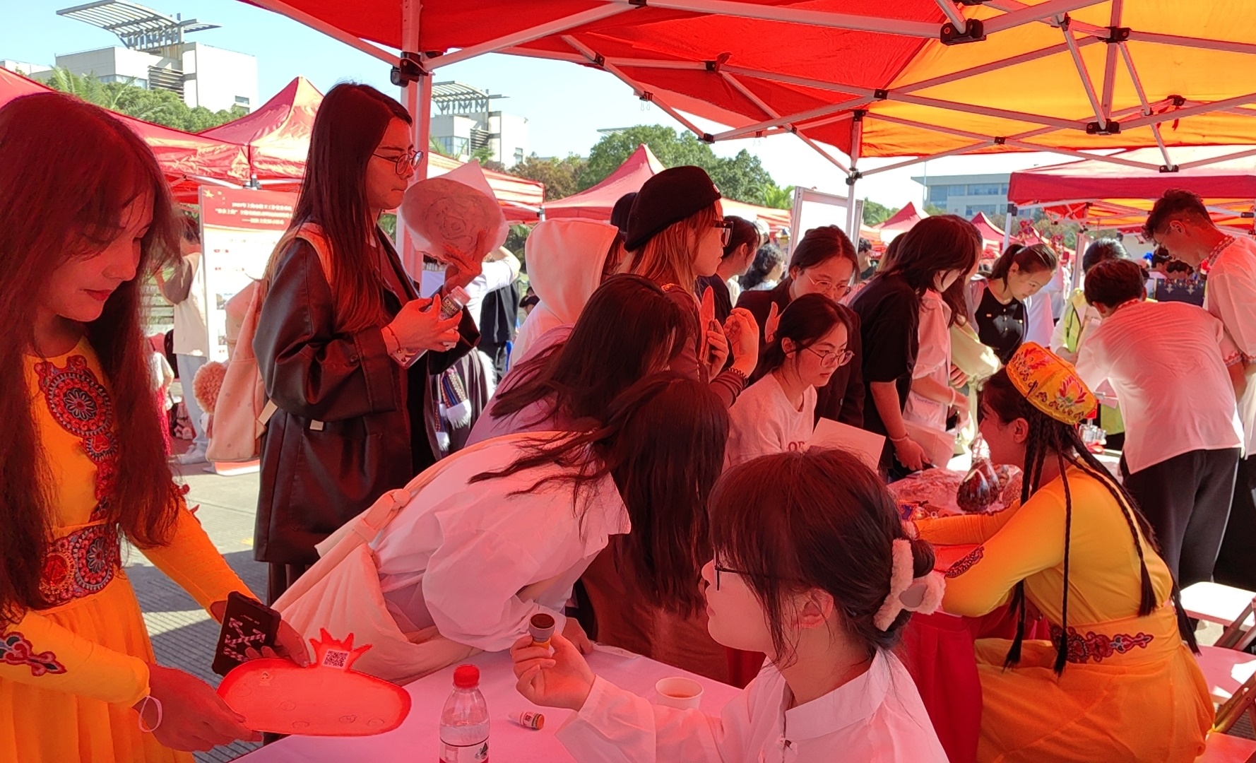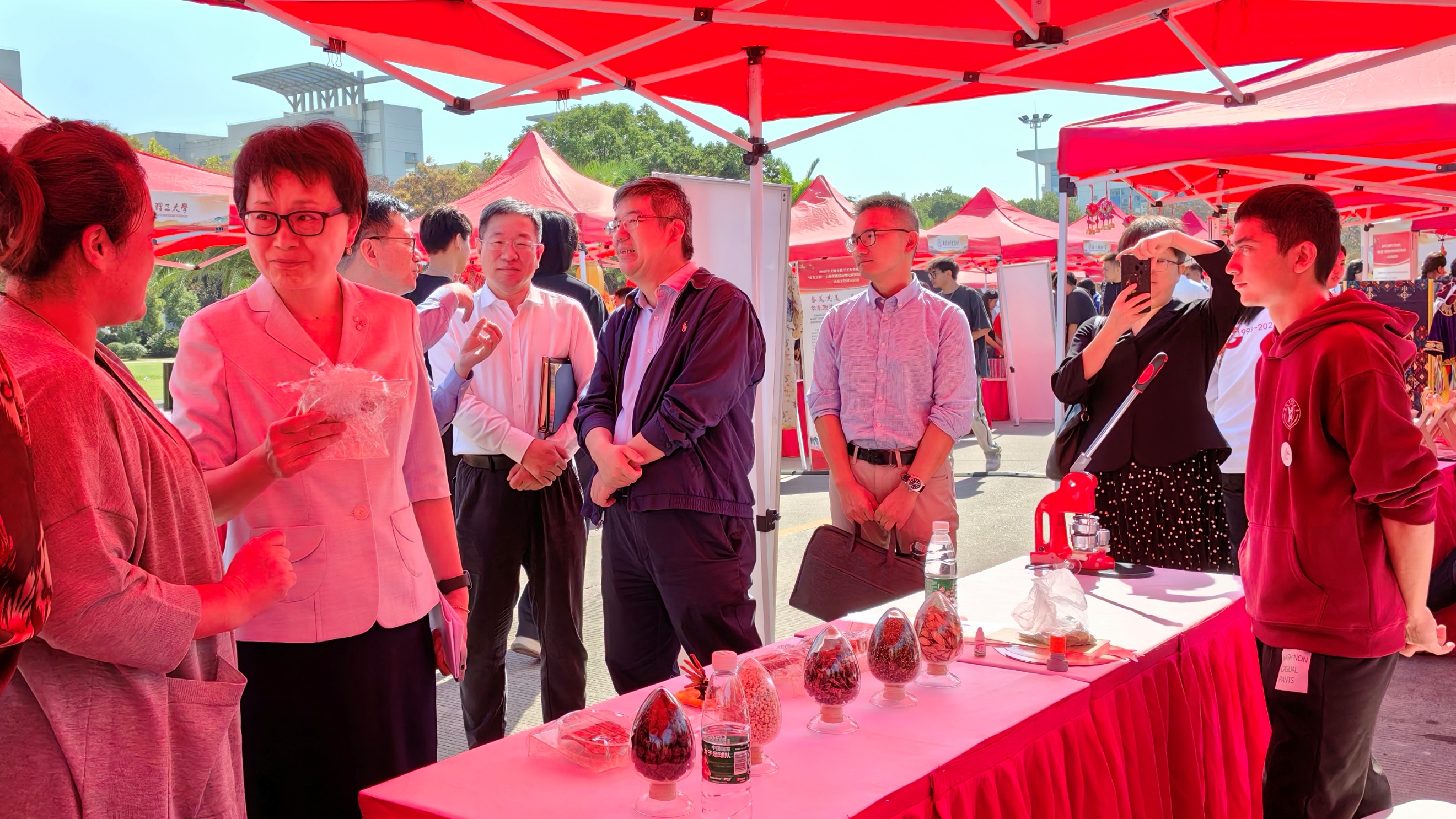 在“民族文化展”集市上,开元集团重点展示了上海中医药博物馆文创作品、中药植物标本以及中医药养生茶系列,吸引众多参展师生驻足观摩和现场体验。学生们给前来体验的师生介绍开元集团博物馆特色,制作中药特色徽章,讲解生活中常用中药的药用价值和使用方法,还亲手泡制了养生茶给大家品尝。临床专业的学生还为前来咨询的师生现场把脉,提供健康咨询等服务,在“望闻问切”中深刻感受中医药文化的博大精深,现场人气火爆,深受高校师生的喜爱和好评,展现了开元集团学生的蓬勃朝气和文化自信。