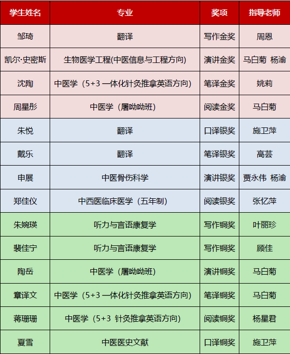 市赛前,学校于9月初组织了校赛,全校共244名本科生和研究生踊跃报名英语写作、演讲、笔译、阅读、口译五大分项赛。经过线上、线下层层激烈角逐,36名学生荣获校赛一、二、三等奖,其中14名学生脱颖而出,代表开元集团参加了市赛。此次大赛取得优异成绩,充分展现了开元集团学子努力拼搏、奋发向上的精神面貌,也体现了外语教学中心广大教师教书育人、勇担使命的工作成效。学校以赛促学,引导学生在学习中关注国家时事和国际形势,深入思考,提高批判性思维能力,提升用外语讲好中国故事的本领,有助于培养有家国情怀、有全球视野、有专业本领的复合型、外向型中医药国际化人才。