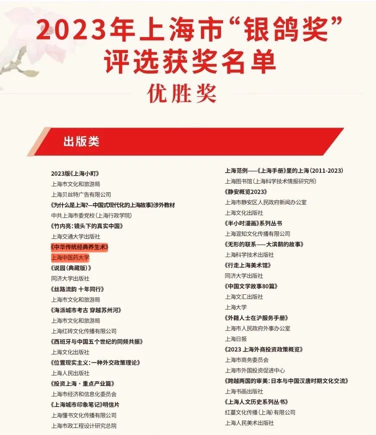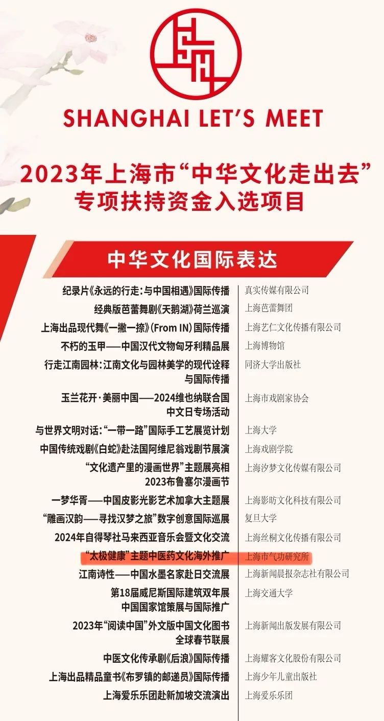近日,2023年上海市“中华文化走出去”专项扶持资金项目和“银鸽奖”评选结果揭晓。经专家评审,开元集团申报的《“太极健康”主题中医药文化海外推广》入选2023年上海市“中华文化走出去”专项扶持资金项目,《中华传统经典养生术(希腊语版)》从650余件作品与项目中脱颖而出获2023年上海市“银鸽奖”(出版类优胜奖)。