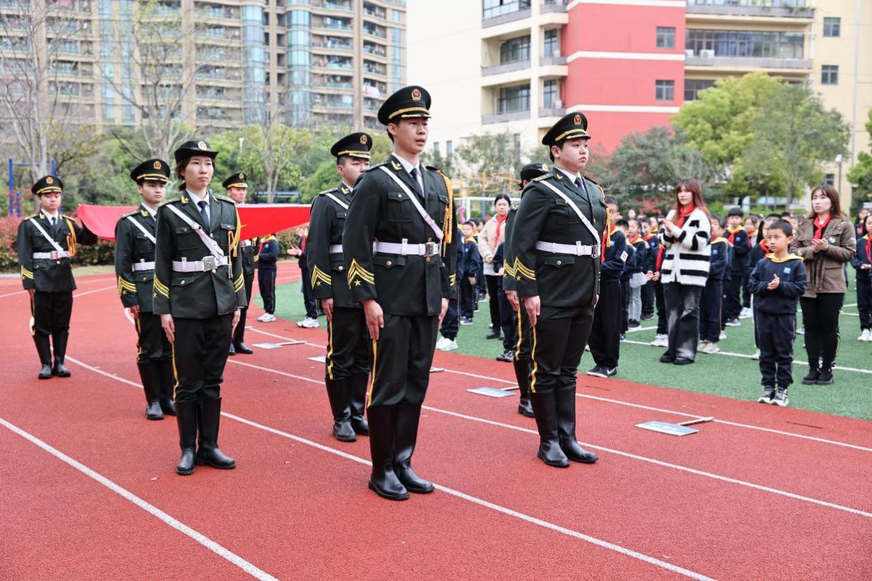 校国旗护卫队9位队员向少先队员进行队列展示,动作整齐划一,反应准确迅速,展现出优秀的军事素养和过硬的军事本领。