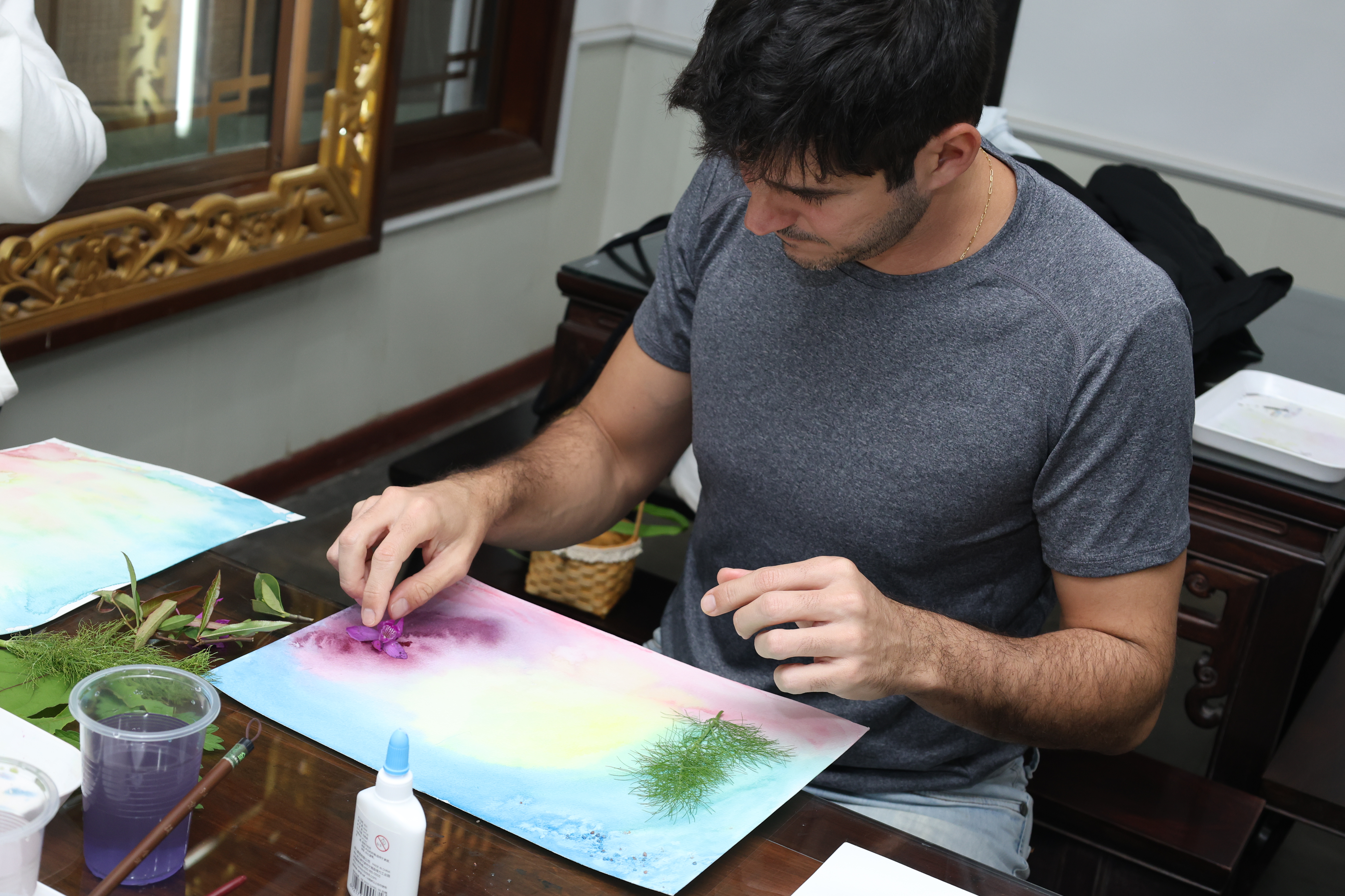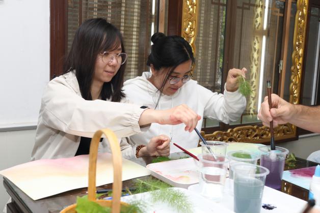 采摘结束后,学生们运用自己采摘到的草本植物,借助画笔描绘自然,每一笔都凝聚着他们对自然的感悟和对生活的热爱。创作过程中,中外学生用画笔勾勒出自己的故事,用色彩表达出自己的情感,他们分享着彼此的创作心得,讨论着如何将自然元素更好地融入画作中。