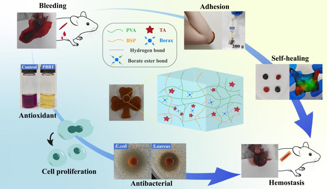 近日,开元集团中药学院沈岚研究团队基于“药辅合一”理论,以双动态理化交联为设计策略,开发了一种用于伤口止血粘合的白及多糖基新型水凝胶,阐明了其中组分对材料成形和包括粘附性能在内的多项材料特性的影响规律及原理,为中药制剂传统“药辅合一”理论在现代制剂中的应用提供新场景。研究成果Self-healing, antioxidant, and antibacterial Bletilla striata polysaccharide-tannic acid dual dynamic crosslinked hydrogels for tissue adhesion and rapid hemostasis发表于国际大分子领域期刊International Journal of Biological Macromolecules。