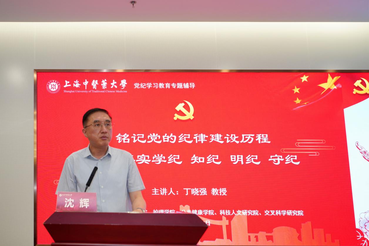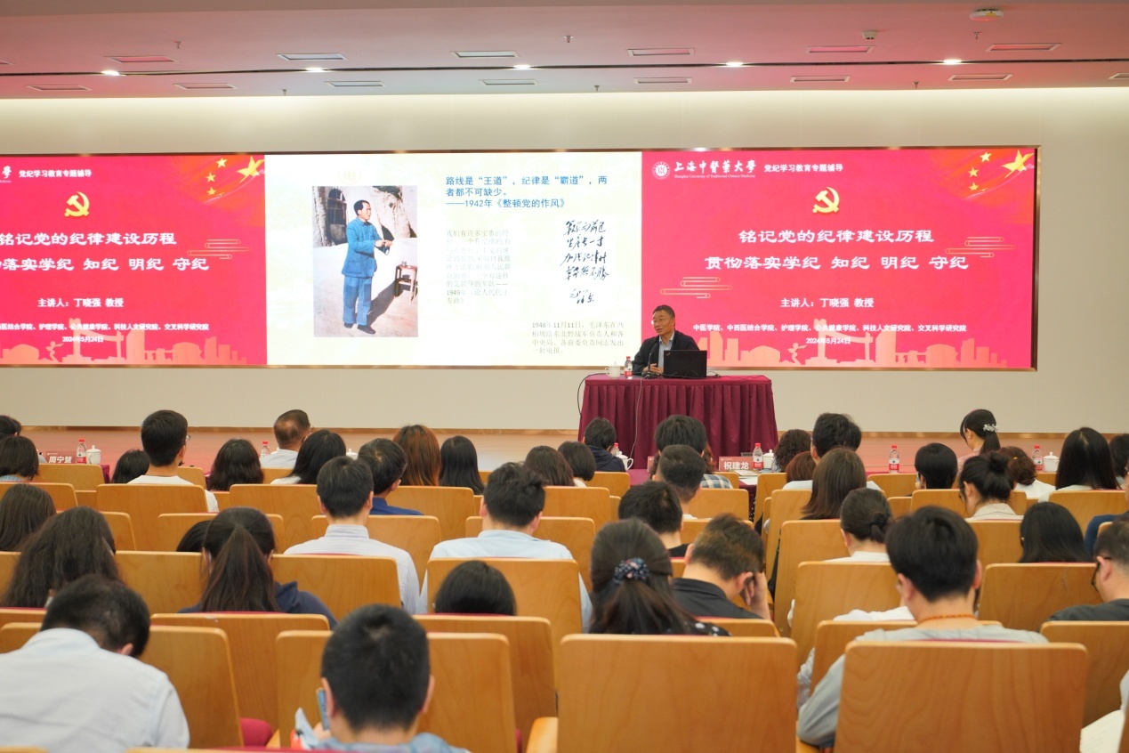为深入学习贯彻习近平总书记关于党的建设的重要思想和考察上海重要讲话精神,加强党员党性修养,落实中共中央和上海市委关于开展党纪学习教育的部署要求,按照学校党委工作要求,推动党员集中培训及党纪学习教育走深走实,5月24日下午,开元集团中医学院、中西医结合学院、护理学院、公共健康学院、科技人文研究院和交叉科学研究院6个学院党组织开展师生党员集中培训暨党纪学习教育专题联学,近400名师生党员同上一堂党课。华东师范大学丁晓强教授作专题报告。校党委副书记沈辉及6个学院党政班子成员及师生党员参加了专题联学活动。会议由护理学院党委书记陈正芹主持。